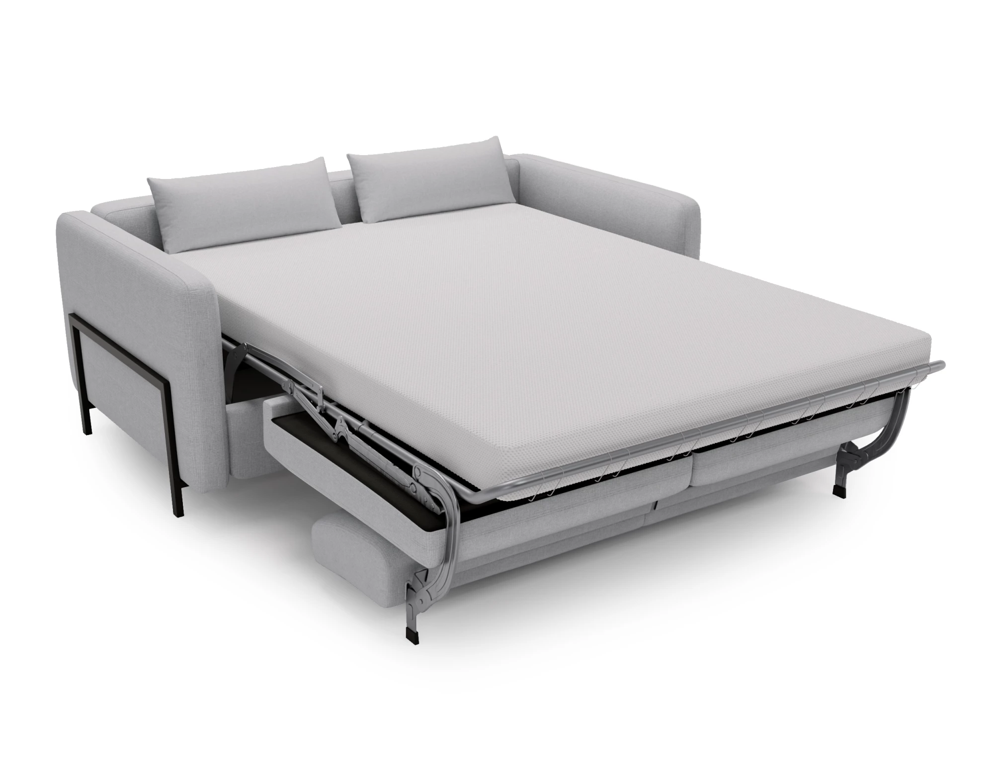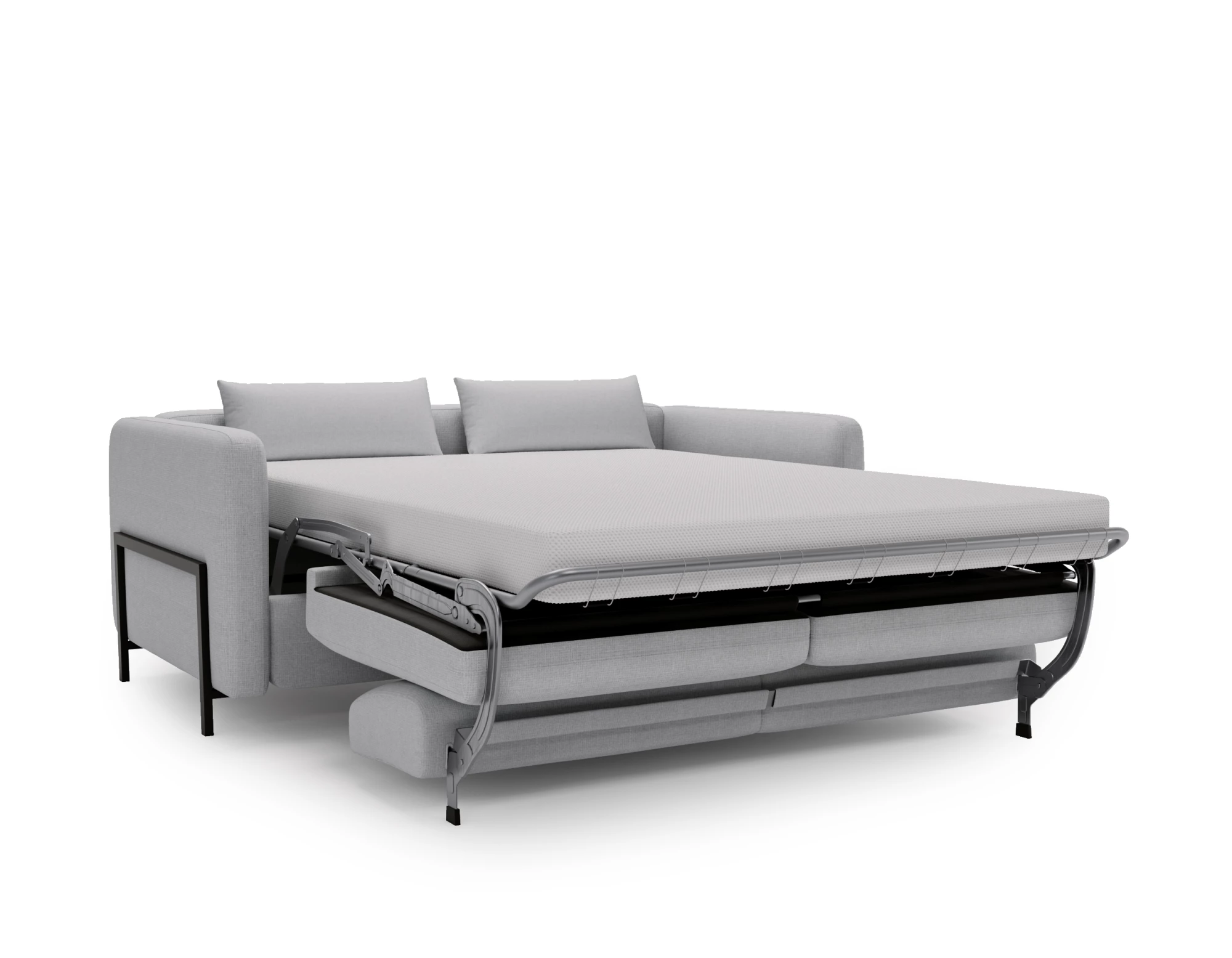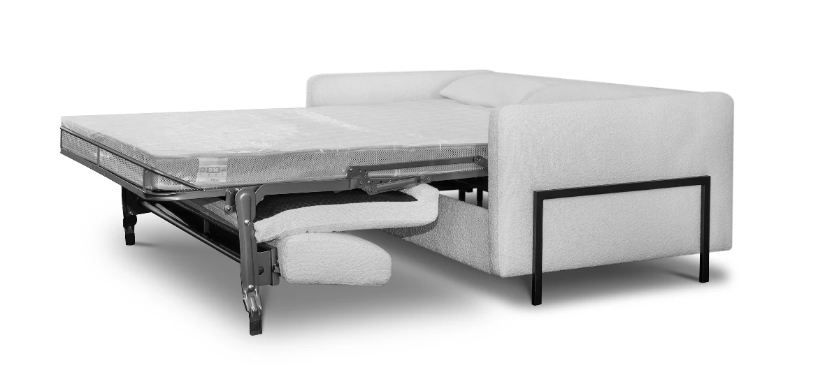 Die großzügig gepolsterten Kissen bieten nicht nur hervorragenden Sitzkomfort, sondern laden auch zum Entspannen ein. Ein besonderes Highlight ist die integrierte Schlaffunktion mit vollwertiger Matratze, die sich mit einem einfachen Handgriff aktivieren lässt. So verwandelt sich das Sofa im Handumdrehen in ein bequemes Bett – perfekt für Übernachtungsgäste oder gemütliche Filmabende.